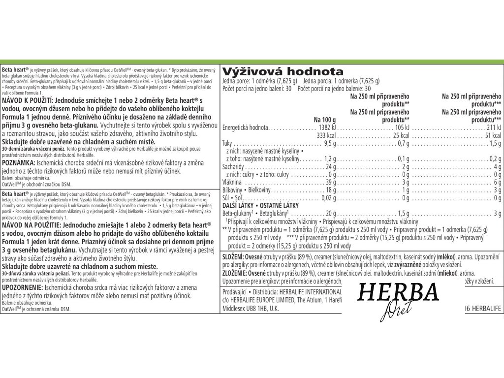 Herbalife Beta heart je doplněk stravy s vanilkovou příchutí, který obsahuje ovesný beta-glukan OatWell™. Je prokázáno, že ovesné beta-glukany výrazně snižují cholesterol v krvi. Beta-glukan přispívá k udržování normální hladiny cholesterolu.